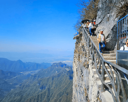 장가계의 천문산에는 해발 1,400m 높이의 절벽을 따라 조성된 **귀곡잔도(鬼谷栈道)**가 있습니다. 이 길은 약 1.6km 길이로, 절벽에 설치된 선반형 길을 따라 걷는 독특한 경험을 제공합니다.